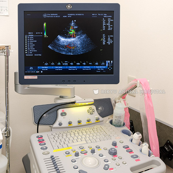 当院が導入している超音波診断装置にはカラードップラーモードというものがあり、血流の向きや速度が検出できます。このパフォーマンスが最も発揮されるのが心臓です。心臓病に罹患すると、心臓の構造が異常になったり、血液が逆流したりするほか、ステージに伴って、血流速に変化が認められるなどします。心臓病のステージ把握には、必須の検査となります。